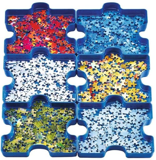 šesť praktických nádob v tvare puzzle dielikov, prehľadné triedenie puzzle podľa tvaru alebo farieb, priehradky je možné pripájať k sebe, po skladaní je možné priehradky jednoducho naskladať na seba (stohovať), triedič aj s dielikmi je možné uschovať späť do krabice, zaberajú menej miesta a dieliky sa nestratia.