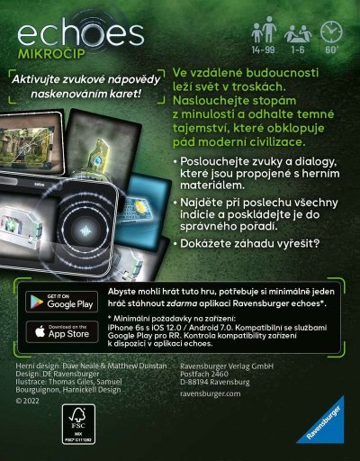 Vo vzdialenej budúcnosti leží svet v troskách. Načúvajte stopám z minulosti a odhaľte temné tajomstvo, ktoré obklopuje pád modernej civilizácie. Echoes, to sú napínavé detektívne hry pre celú rodinu aj partiu priateľov. Ako dobre dokážete počúvať zvuky vo svojom okolí? V hre echoes vyšetrujete záhady za použitia svojich špeciálnych schopností. Až budete skúmať jednotlivé predmety, budete počuť ozveny z minulosti – tajomné zvuky a hlasy, ktoré vám umožnia odhaliť tajnú históriu predmetov a zoradiť udalosti do správneho poradia. Aktivujte zvukového pomocníka naskenovaním kariet. Počúvajte zvuky a dialógy, ktoré sú prepojené s herným materiálom. Nájdite pri počúvaní všetky indície, poskladajte ich do správneho poradia a vyriešte záhadu. K hre je nutné stiahnuť zadarmo aplikáciu Ravensburger echoes, ktorá je kompletne nahovorená v češtine - rozprávač Václav Neužil.