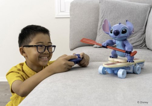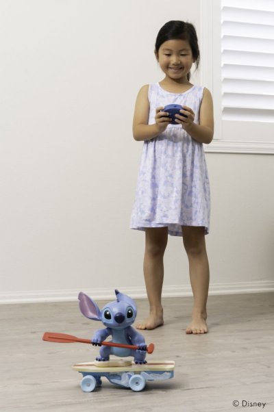 RC Stitch Surfer na diaľkové ovládanie. 1 kanál (jazdí dopredu, vzad zatáča), frekvencia 2.4 GHz. Keď Stitch spadne vie sa sám zdvihnúť späť. Dĺžka 25 cm.