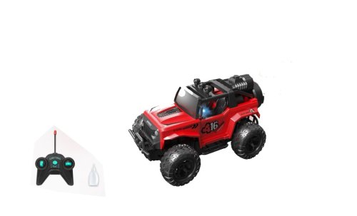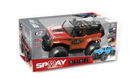 Terénne auto v mierke 1:16. Auto jazdí vpred, vzad a zatáča, svietia mu svetlá, a navyše sa mu pri jazde fajčí z výfuku! Ceruzkové batérie pre prevádzku auta a ovládače nie sú súčasťou balenia. V ponuke modrá a červená farba. Veľkosť autíčka 24×12,7×14,6 cm. Maximálna rýchlosť 1,3 km/h. Frekvencia 40MHz, frekvenčné pásmo 40,680MHZ, maximálny rádiofrekvenčný výkon 0,023mW, dosah diaľkového ovládania 15m.