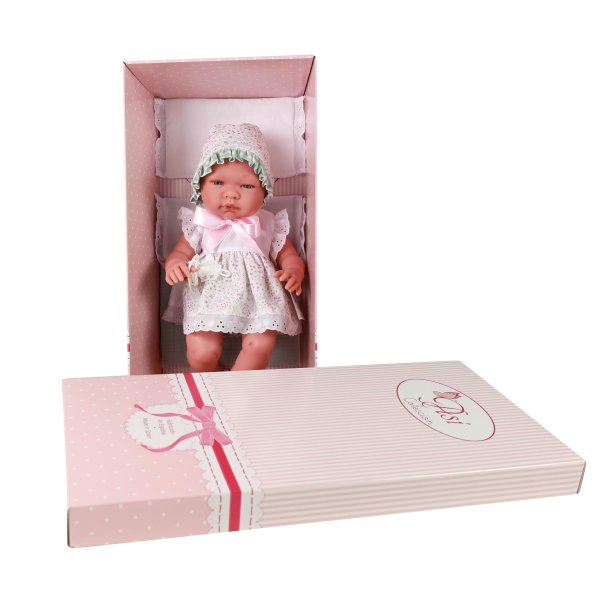Krásne realistické bábätko dievčatko María je vyrobené firmou Asivil v Španielsku. Bábätko je 43 cm dlhé, má tvrdé – vinylové telíčko, prepracované do všetkých detailov, vrátane pohlavia. Má nemrkacie akrylové oči a nalepené riasy. Bábätko nemá vlásky, má nemrkacie akrylové oči modrej farby a nalepené riasy. María je oblečená do krásnych čipkových šiat a čiapočky. Dievčatko leží na vankúšiku a perinke, má cumlík na retiazke, ktorý je možné vložiť do pusinky a drží tam. Asivil je rodinný podnik, ktorý sa viac ako 50 rokov pýši výrobou vysoko kvalitných bábik, známych pod značkou ASI. Bábiky sú ešte krajšie tým, že sa firma zaviazala k 100% španielskej remeselnej výrobe, spĺňajúcej všetky európske výrobné normy. Ich produkty kombinujú tradíciu aj moderné trendy. Bábika je balená v darčekovej krabici a spĺňa bezpečnostné a zdravotné normy (CE). Odporúčané pre deti od 3 rokov.
