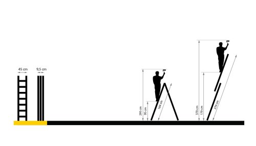 výška rebríka jedna základňa: 2,7 m výška rebríka dve základne: 1,64 m pracovná výška jedna základňa: 3,7 m pracovná výška dve základne: 2,95 m šírka: 0,70 m (základne) prepravný rozmer: 164x45x10 cm max.nosnosť : 150 kg 131