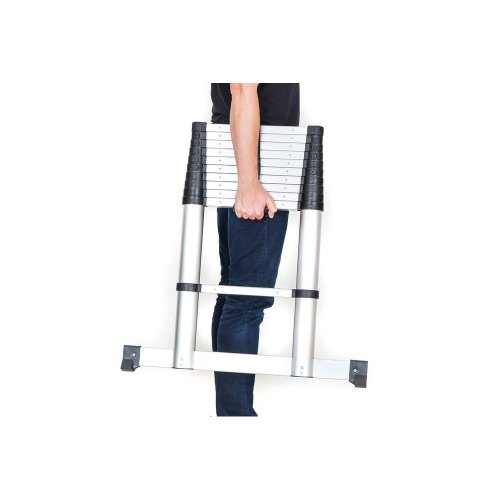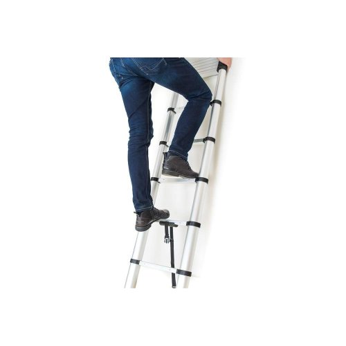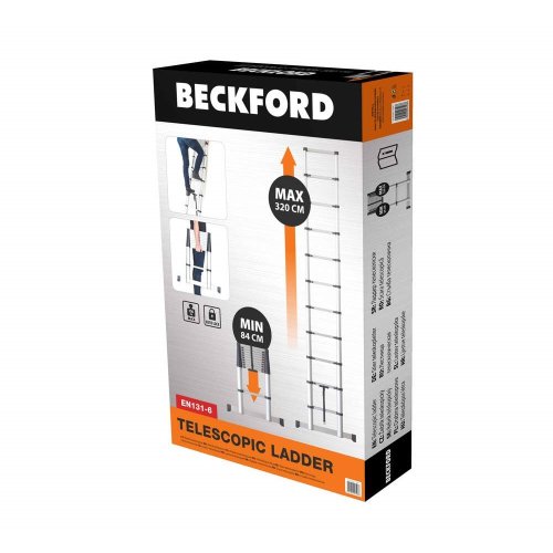 Teleskopický rebrík 320 x 81 x 8 cm Hliníkový teleskopický rebrík s veľmi stabilnou konštrukciou, so stabilizačnou základňou a bezpečnostným spomaľovacím systémom skladania - podľa najnovšej normy EN 131-6. Automatický zámok jednotlivých priečok, maximálna nosnosť 150kg. Výška iba 84 cm v zloženom stave umožňuje ľahké prenášanie, uskladnenie aj prevoz napríklad autom. Možnosť voliteľnej výšky výsuvu podľa potreby. Rebrík má celkom 10 priečok + horné madlo + spodná stabilizačná lišta. Rozostup priečok je 29 cm. Dĺžka (cm): 320 | Rozmery (cm): 320 / 84 x 81 x 8 | Materiál: Hliník | Farba: Strieborná / čierna | Hmotnosť netto (kg): 12 | Hmotnosť brutto (kg): 12,6 | Záruka (v mesiacoch): 24 mesiacov | Výrobca / značka: BECKFORD