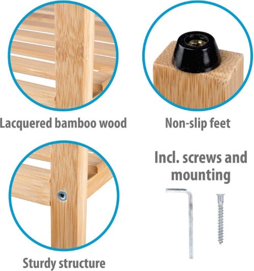Bambus je materiál, ktorý sa perfektne hodí do rôznych štýlov interiérového designu. Patrí tiež medzi tvrdšie dreviny a preto veľmi robustné a odolné. To všetko robí z bambusu perfektný materiál pre každú poličku v kúpeľni. Drevo môže byť otlčené, je odolné proti vlhkosti, nehnije a nevyžaduje žiadnu až žiadnu údržbu. Pre väčšiu pevnosť sú k poličke pripevnené protišmykové nožičky. Rozmer 1195 x 315 x 330 mm Hmotnosť cca. 2.900 kg
