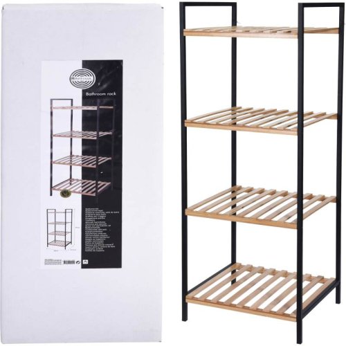 úložný policový regál nielen do kúpeľne - oceľová konštrukcia v matnej čiernej farbe - ochranný nástrek predlžuje životnosť, bráni proti korózii - rebrované police z prírodného bambusového dreva - regál obsahuje celkom 4 rovnako veľké drevené police - užitočný pre skladovanie prakticky čohokoľvek - regál nájde využitie kdekoľvek v domácnosti, predovšetkým v kúpeľni - ľahké premiestňovanie vďaka ľahkej váhe - rozmery celkové: 38 x 33 x 95 cm - rozmery jednej police: 35 x 33 cm