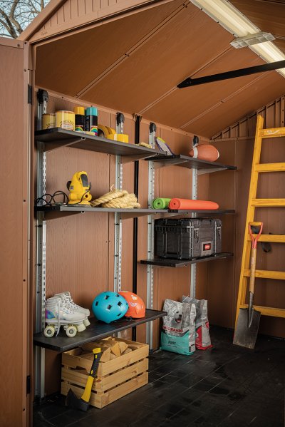 3 police spevnené oceľou uchytíte na koľajnice. Výšku každej z nich si prispôsobíte tak, aby ste na ne bez problémov dosiahli. Jedna polica unesie až 30 kg záťaže. Regál vám umožní zorganizovať záhradné náčinie, náradie, štetce, plechovky, vankúše, hračky alebo čokoľvek iné, čo v domčeku Keter skladujete.