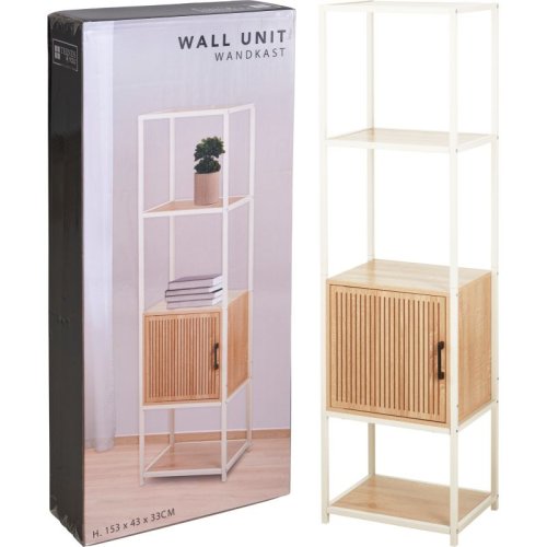 Štýlová a praktická skrinka s bielym kovovým rámom , vybavená policami a dvierkami z MDF dyhy z prírodného dreva . Ponúka 5 úložných vrstiev pre organizáciu vecí a doplnkov.