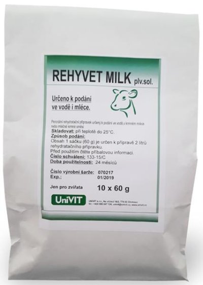 REHYVET MILK je schválený veterinárny prípravok, je účinným riešením problémov dehydratácie a acidózy vzniknutej pri hnačkových ochoreniach u teliat. Vďaka použitému citronanu je možné kombinovať liečbu spolu s napájaním mliekom. Tým sa do tela teľaťa dopraví dostatok energie a bielkovín, ktoré aj poškodené črevo je schopné aspoň čiastočne vstrebať a tráviť. Po aplikácii pripraveného roztoku dochádza k rýchlemu vyrovnaniu straty vody, sodíkových a draselných iónov a energie. Citronan sodný slúži v tele ako zdroj bikarbonátu a kompenzuje tak metabolickú acidózu vznikajúcu pri hnačkových ochoreniach. Glukóza ako zdroj pohotovej energie je nevyhnutná aj na resorpciu elektrolytov a vody z tenkého čreva. Probiotiká, obsiahnuté v prípravku, zlepšujú rovnováhu črevnej mikroflóry, podporujú jej rast. Tým dochádza k potlačovaniu škodlivých mikroorganizmov a tiež k zvýšeniu odolnosti črevnej mikroflóry. Chlorid draselný a sodný nahrádzajú stratu sodíkových a draselných elektrolytov. Dehydratácia organizmu (ľahký a stredný stupeň), hnačkové ochorenia teliat.