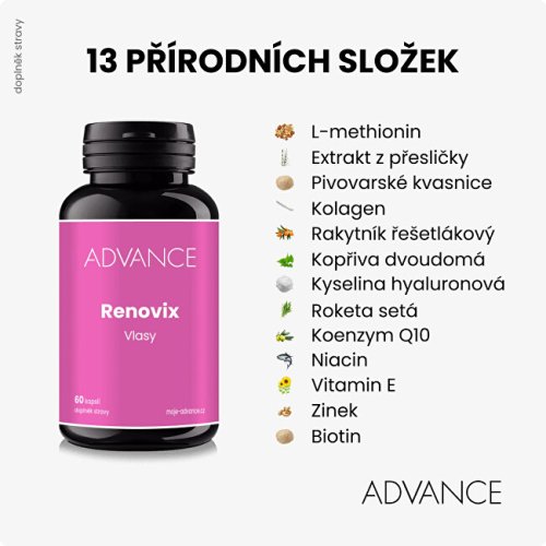Renovix je unikátny doplnok stravy. Obsiahnuté prírodné aktívne látky napomáhajú komplexne sa starať o Vaše vlasy, podporujú ich rast a prispievajú tak k udržaniu krásnych a zdravých vlasov.