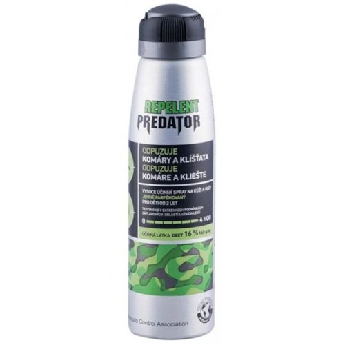 Univerzálny aerosólový repelent Predator 16% proti komárom, kliešťom a muchničkám vhodný na aplikáciu na pokožku i odev. Možno použiť vo všetkých zemepisných pásmach proti všetkým druhom komárov a kliešťov vrátane tropických. Výhoda aerosólovej aplikácie spočíva v dokonalejšom rozptýlení na všetky časti tela, obuvi a odevov. Toho docielite u výrobkov Predator vďaka 360 ° ventilu, dokonalému roztoku a jemnému rozprašovaniu. Tohto efektu nedocielite pri sprejoch s mechanickým rozprašovačom, kde pri rozprašovaní ošetríte len ohraničené kruhy, medzi ktorými zostane neošetrené miesto, na ktoré sa hmyz dostane a bodne. Pre deti od 2 rokov. Doba účinnosti 2–4 hodiny. Hlavné prednosti: