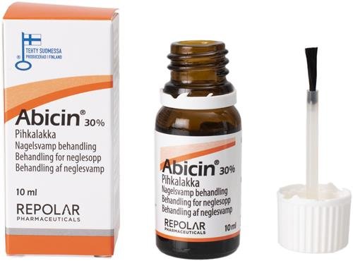 Liečba plesňovej infekcie nechtov : V prípade potreby povrch nechtu zdrsnite pilníkom, umyte a osušte pred aplikáciou laku. Naneste tenkú vrstvu laku na celý postihnutý povrch nechtu pomocou štetca, ktorý je súčasťou uzáveru a nechajte zaschnúť. Pokračujte v liečbe liekom Abicin dvakrát týždenne, kým nebude poškodený necht nahradený novým, zdravým nechtom.