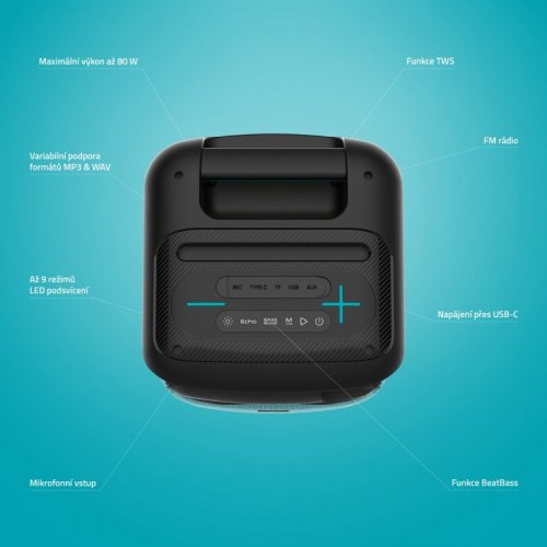 Vyberte si jeden z 9 nastaviteľných LED efektov a vytvorte dokonalú atmosféru na každej párty. K reproduktoru navyše dostanete aj bezdrôtový mikrofón . Pripojte ho k nemu, zapnite karaoke režim a užite si zábavu s priateľmi.