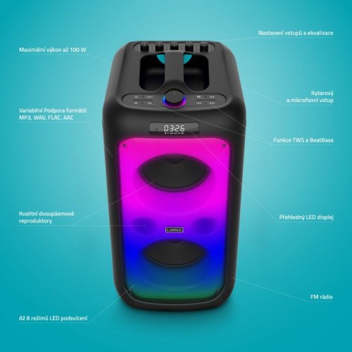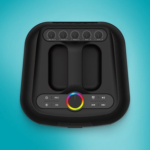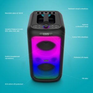 Vyberte si jeden z 8 nastaviteľných LED efektov a vytvorte dokonalú atmosféru na každej párty. K reproduktoru navyše dostanete aj bezdrôtový mikrofón . Pripojte ho k nemu, zapnite karaoke režim a užite si zábavu s priateľmi. Svoj spevácky výkon môžete dokonca nahrať.