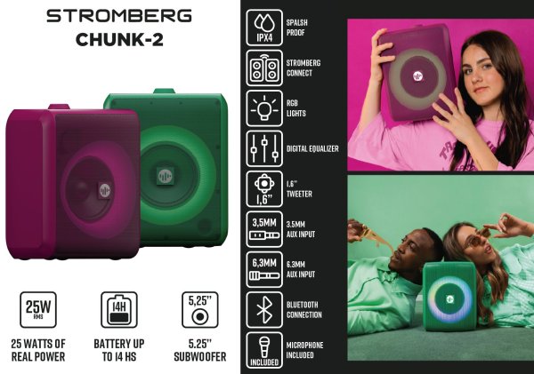 Stromberg CHUNK vás prekvapí nielen svojim štýlovým vzhľadom vo výraznej farbe, ale aj funkciami, ktoré oceníte doma aj vonku. V balení nájdete káblový mikrofón , vďaka ktorému môžete ľahko spustiť karaoke alebo viesť prezentáciu. Funkcia TWS umožňuje prepojenie dvoch jednotiek pre stereo efekt a IPX4 krytie zaistí ochranu pred striekajúcou vodou. Vďaka hmotnosti 2,3 kg a kompaktným rozmerom si reproduktor vezmete kamkoľvek so sebou.
