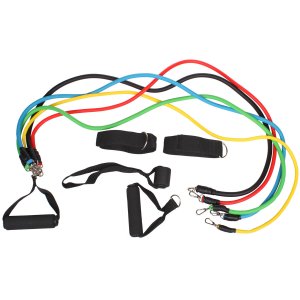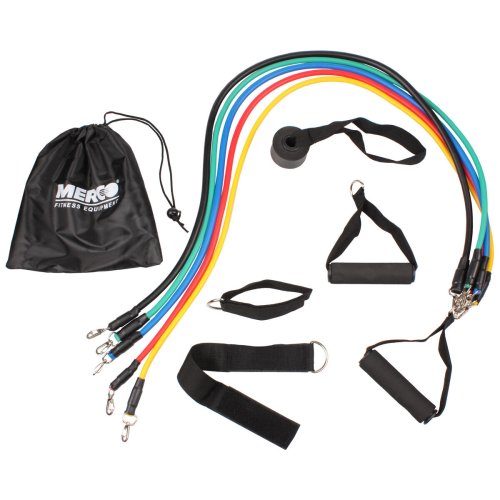 Súprava odporových gúm Merco Resistance Band Set ponúka efektívny spôsob posilňovania, tvarovania hornej i dolnej polovice tela a spaľovania kalórií. Vďaka rôznym odporom gúm si nastavíte obtiažnosť tréningu podľa svojich možností a predstáv. Set je tak vhodný prakticky pre všetkých, či už ste úplný začiatočník alebo pravidelný športovec. Táto fitness sada obsahuje päť posilňovacích gúm, dve madlá s penovým povrchom pre príjemný úchop, dve členkové pásiky so zapínaním na suchý zips a kotvu na uchytenie do dverí. Gumy sú vyrobené z elastického TPE materiálu ak madlám ich jednoducho pripnete pomocou kovových karabínok na oboch koncoch. Celá sada je zabalená v praktickom sáčku, vďaka ktorému ju ľahko prenesiete a vy si tak môžete vytvoriť tréning prakticky kedykoľvek a kdekoľvek. Odpor gúm - žltá: 10 LBS / 4,5 kg - červená: 15 LBS / 6,8 kg - modrá: 20 LBS / 9,1 kg - zelená: 25 LBS / 11,3 kg - čierna: 30 LBS / 13,6 kg - balenie: 5x odporová guma, 2x rukoväť, 2x rukoväť, 2x materiál: TPE, polyester, plast - súčasťou praktické vrecko - dĺžka gúm: 110 cm - madlo: 12 x 3,5 cm (šírka x priemer)