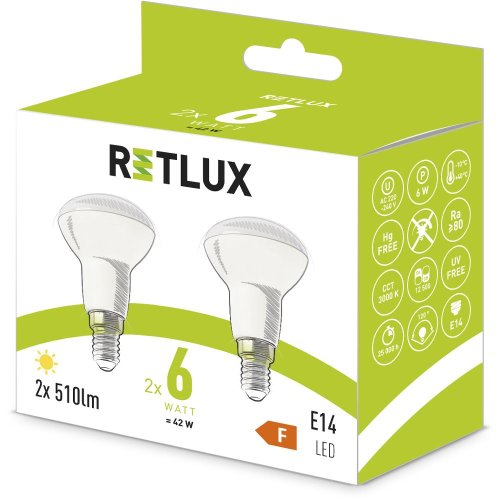 Ekonomická sada 2ks LED žiaroviek Príkon 6 W (2x6 W) Populárna náhrada za vláknovú žiarovku 42W Bežná objímka E14 Svetelný tok 510lm 12500 spínacích cyklov Tvar reflektor R50 Farba svetla: 3000K teplá 0 mm (d Ø)
