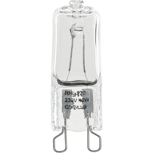 Halogénová žiarovka do rúr na pečenie Napätie: 230V Príkon: 40 W Úsporný ekvivalent: 55W Pätica G9 Stmievateľnosť 2800K - teplá biela Index podania farieb (Ra): 80 Vyžarovací uhol: 300° Životnosť viac ako 2 00 tok: 460 lm Rozmery: 34x13x13 mm (vxšxh)