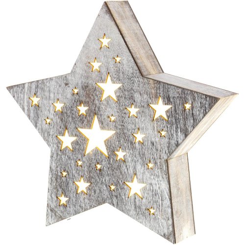 Vianočná dekorácia - hviezda drevená s perforáciou v tvare hviezdičiek Rovnomerné podsvietenie Farba svetla: teplá biela Rozmery: 24 x 4,6 x 22 cm Vhodné iba pre vnútorné použitie (IP 20) Napájanie: 2x AAA Batérie nie sú súčasťou balenia