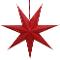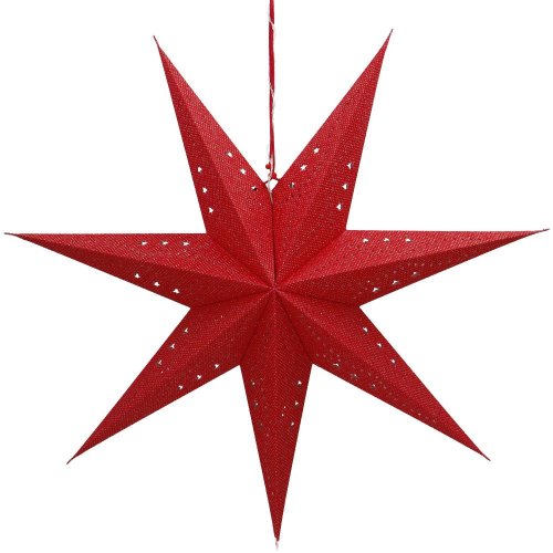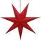 Hviezda vianočná sedemcípa Materiál: Zmes papiera a bavlny Trblietavý posyp zlatej farby Farba červená 10LED Farba svetla: teplá biela Napájanie: 3xAA Časovač: 6/18 h Priemer hviezdy: 60cm Batérie nie sú súčasťou balenia