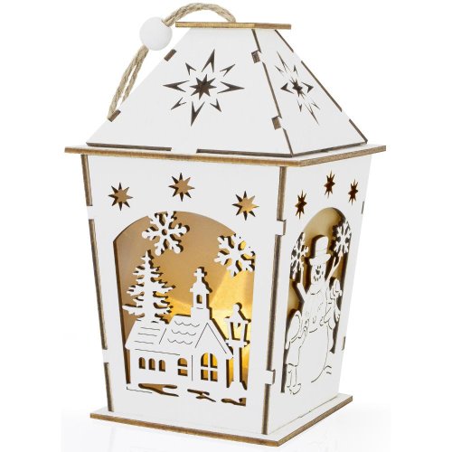 Drevený lampáš Z dvoch strán je ponúkaný dekor snehuliaka, z ostatných sa môžete tešiť na zasnežený kostol. Osvietenie zaisťuje 1 LED svetlo v teplej bielej farbe s 3D efektom hviezdy.