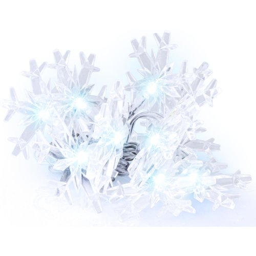 Girlanda s vločkami 10 LED Materiál: plast Časovač: 6/18 h Veľkosť vločky: 4,5 cm Dĺžka osvetlenej časti 1,35 m Dĺžka prívodného kábla: 0,3 m Počet LED: 10 Farba svetla: studená biela Batéria: 2x AA ( nie sú súčasťou balenia) Len na vnútorné použitie IP20