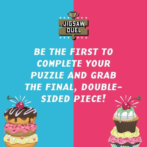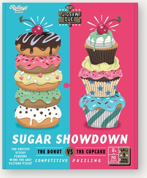 Súťažné puzzle pre dvoch – to je puzzle Duel od Ridley's Games. Skladačku však môže úspešne dokončiť iba ten rýchlejší z vás. Súťaží sa totiž o posledný dielik, ktorý je obojstranný a spoločný pre obe puzzle. Najskôr si vyberte svoj obľúbený dezert (cupcakes alebo donuty), odštartujte závod a pustite sa do skladania. Víťazom sa stáva ten, kto ako prvý poskladá svoje puzzle a vloží doňho posledný dielik. Ideálne pre všetkých, ktorí si chcú zaskladať aj zasúťažiť.. Súčasťou balenia sú dve farebné predlohy skladaného motívu a drevený stojan, ktorý drží posledný vytúžený dielik. Rozmer zloženého puzzle cca 12 x 26 cm