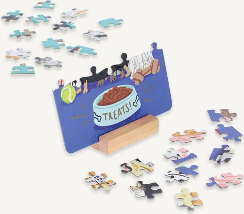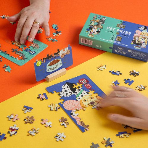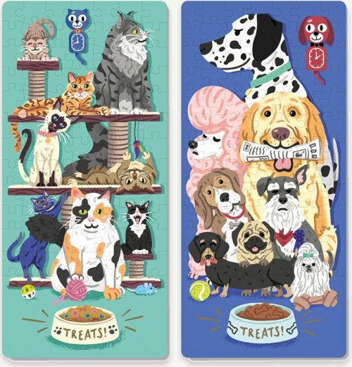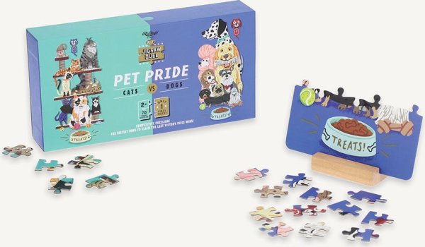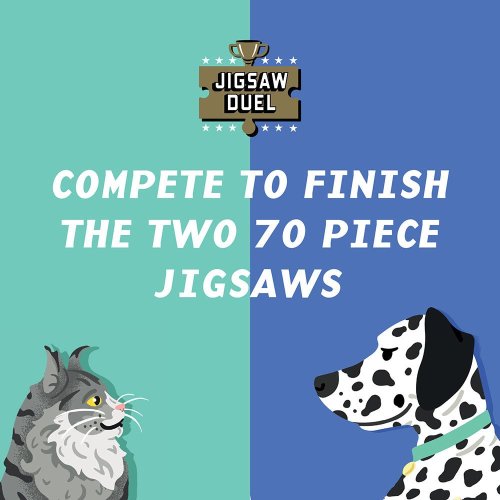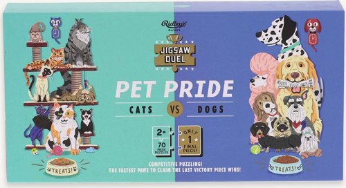 Súťažné puzzle pre dvoch – to je puzzle Duel od Ridley's Games. Skladačku však môže úspešne dokončiť iba ten rýchlejší z vás. Súťaží sa totiž o posledný dielik, ktorý je obojstranný a spoločný pre obe puzzle. Najskôr si vyberte svojich obľúbených domácich miláčikov (mačky alebo psy), odštartujte závod a pustite sa do skladania. Víťazom sa stáva ten, kto ako prvý poskladá svoje puzzle a vloží doňho posledný dielik. Ideálne pre všetkých, ktorí si chcú zaskladať aj zasúťažiť.. Súčasťou balenia sú dve farebné predlohy skladaného motívu a drevený stojan, ktorý drží posledný vytúžený dielik. Balenie je úplne bez plastových obalov. Rozmer zloženého puzzle cca 12 x 26 cm