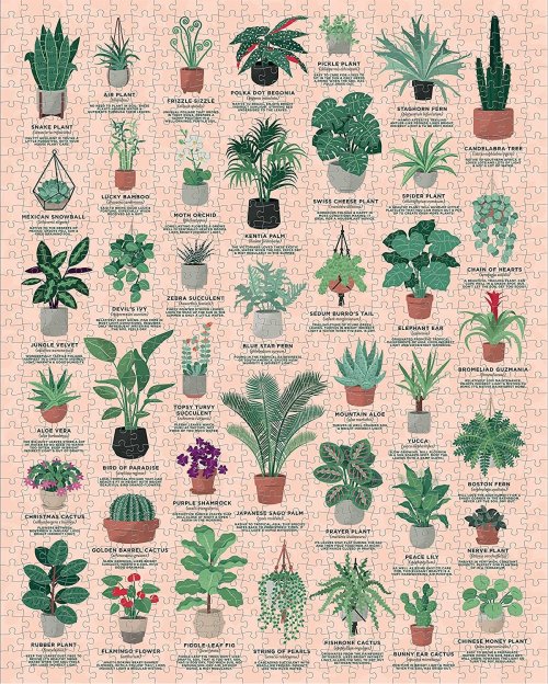 Viac ako 30 izbových rastlín a zaujímavé fakty a pokyny na starostlivosť o ne. Texty na puzzle sú v angličtine. Súčasťou balenia je predloha skladaného motívu.