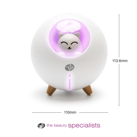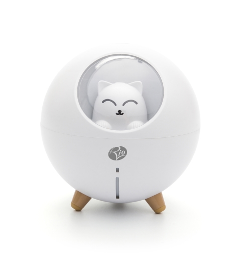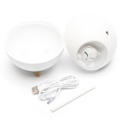 Difuzér esenciálnych olejov, zvlhčovač vzduchu a detské nočné svetlo napájané z USB Vhodný pre použitie v detskej izbe alebo detskej izbe S roztomilou, rozkošnou mačkou Možno použiť s esenciálnymi olejmi Kapacita 220 ml vody pre 5 hodín nepretržitého zahmlievania Automatické vypnutie Prevádzka z USB Podporuje pokoj Upokojujúce, jemné nočné svetlo so 7 farbami