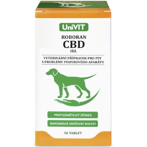 ROBORAN CBD tbl. je schválený veterinárny prípravok, vo forme komplexného tabletovaného prípravku využívajúci široké spektrum účinkov prírodných kanabiodiolov, hesperidínu a MSM. Hesperidín - zvyšuje biologickú dostupnosť a účinky CBD a MSM.