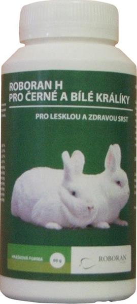Roboran H pre králiky čierne a biele odporúčame pri tradičnom kŕmení aj pri použití kompletných kŕmnych zmesí. Prípravok je určený pre králiky s čiernym a bielym sfarbením, u ktorých je nežiaduci žltý alebo hnedý nádych srsti. Má výrazný vplyv na zlepšenie farby, kvality srsti a zdravotného stavu kože. Je vhodný pre krátko aj dlhosrsté králiky, pre zakrpatené aj veľké plemená.