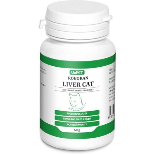 Roboran LIVER CAT je sypký prípravok určený na podporu fyziologických funkcií pečene s detoxikačnými a hepatoprotektívnymi účinkami. Je vhodný ako súčasť liečby infekčných ochorení pečene (infekčná hepatitída), chronických pečeňových chorôb (cirhosis), pri otravách, pri podávaní antibiotík, antiparazitík a ďalších liekov, pri strate chuti do jedla, pri pooperačných stavoch av rekonvalescencii.