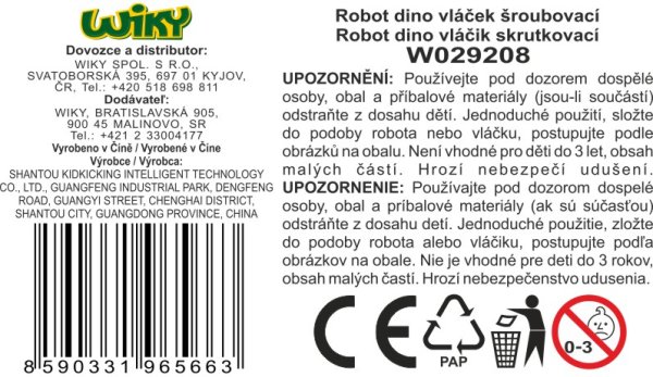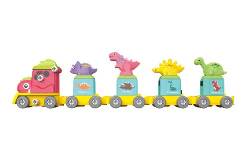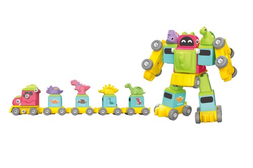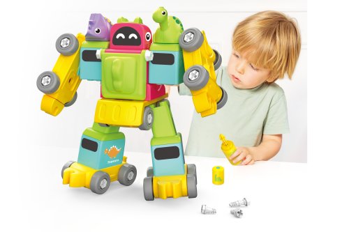 Robot dino vláčik skrutkovacie. Balenie obsahuje rozloženú mašinku so 4 vagónmi, návod na zloženie vláčika aj robota a skrutkovač. Je možné zložiť vláčik so 4 vagónikmi, alebo jedného robota.