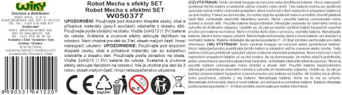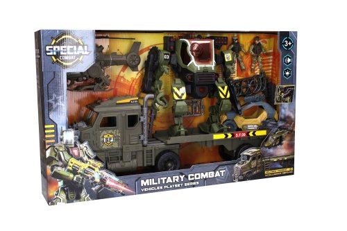 Robot mecha s efektmi set s ťahačom a helikoptérou. Obsah balenia - vojenský ťahač 60x11x21 cm (voľné kolesá), robot s efektmi 25x11x26 cm, helikoptéra 24x13 cm, bugína s guľometom 16 cm, 2x figúrka pilot 11 cm, opevnenie a vybavenie pre vojakov. Robot vydáva svetelné a zvukové efekty. Aktivácia tlačidlom v strede robota. Opakovaným stlačením sa prepínajú rôzne zvukové efekty (pohyb robota, streľba, apod.). Robot - 2xAG13 batéria súčasťou balenia.