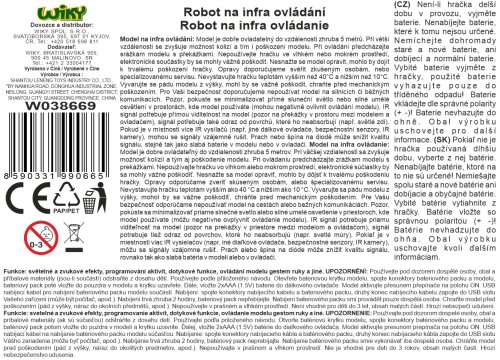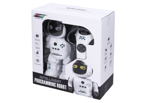 Robot RC na diaľkové ovládanie. Rozmery 13,2x10,5x26,3 cm. Infračervený port. Ovládanie dotykom, pohybom ruky a ovládačom. Svetelné a zvukové efekty. Funkcia - podsvietená tvár (mení výraz), pohyb hlavy, ovládanie pohybom ruky, ovládanie dotykom, programovanie, demo režim, zvuky, hudba, nastavenie hlasitosti. 3.7V 500mAh batériový potom do robota súčasťou, 2xAAA do ovládača nie sú súčasťou. USB kábel súčasťou. Tlačidlo ON/OFF na hrudi robota.