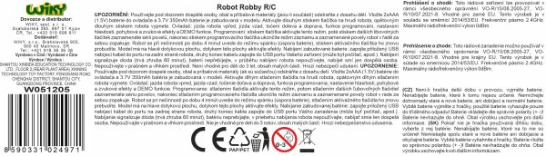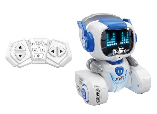 Robot Robby RC na diaľkové ovládanie. Rozmery 13x9x15 cm. Frekvencia 2.4GHz. Svetelné a zvukové efekty. Batériový pack 3.7V 350mAh Lítium do robota súčasťou, 2xAAA do ovládača nie sú súčasťou. USB kábel súčasťou. Ovládač - pohyb dopredu a dozadu, otáčanie vľavo a vpravo, tanec, programovanie, ovládanie hlasitosti, demo režim, zvukové efekty (hudba).