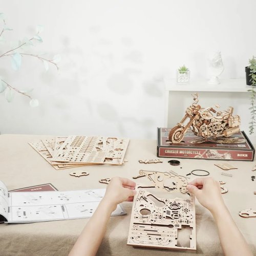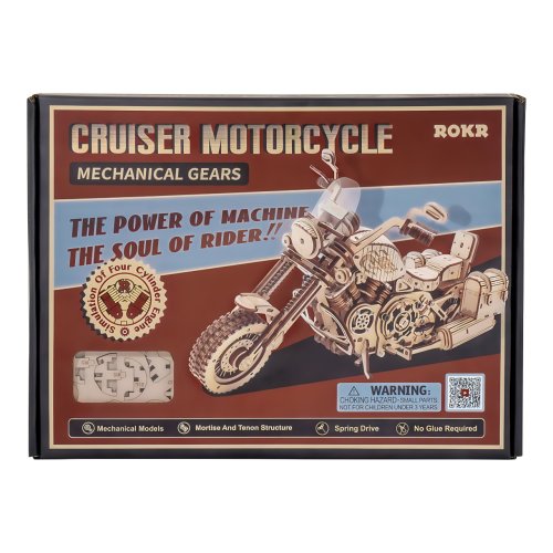 Stavebnica ťažkého cestovného motocykla vyrobená z preglejky, je určená všetkým, ktorí snívajú o bezstarostnej jazde divokým západom. Model je vybavený naťahovacím pružinovým strojčekom vybaveným spúšťou, vďaka ktorému je schopný svižnej jazdy. Smer je možné čiastočne ovládať nastavením funkčných riadidiel a chod motora je pritom pútavo stvárnený pohybom piestov. Motorka zaujme aj ďalšími funkčnými mechanickými podrobnosťami, odpružením vidlice predného kolesa, či stojanom, s ktorého pomocou šikovne skrášli poličku, či stôl vo vašej izbe, alebo kancelárii. Po oboch stranách sedla je vybavená užitočnými skrinkami, ktoré poslúžia hrám, ale je možné do nich uložiť aj drobnú cennosť, alebo odkaz. Skladačka je dodávaná v nezloženom stave, balená v krabici. Vybavené detailným návodom na zostavenie. Hlavné vlastnosti: 420 precízne vyrezaných dielikov stredná obtiažnosť zostavenia výsledný model je riaditeľný a schopný samostatné jazdy drobný úložný priestor
