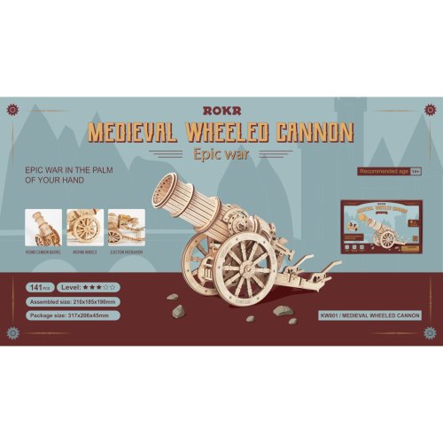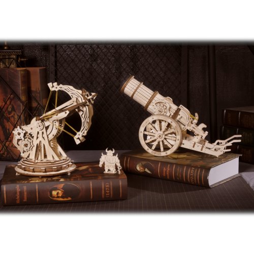 Staňte sa slávnymi dobyvateľmi prostredníctvom radu mechanických skladačiek obliehacích strojov Robotime. Zakúste výzvu pri ich stavbe, precvičujte logiku aj zručnosť as pomocou hotových modelov potom usporiadajte tie najpamätnejšie bitky! Skvelý darček pre všetkých fanúšikov vojnových hier, vojenstva a histórie! Obliehací kanón sa môže pýšiť mnohými atraktívnymi detailmi verne odrážajúcimi stredoveké zbrane. Jeho rozmerná hlaveň je prispôsobená na streľbu pingpongových loptičiek, čo z neho robí obzvlášť univerzálnu hračku. Mechanizmus streľby je ručne naťahovaný a je opatrený spúšťou, uhol odpalu je možné voľne nastaviť. Vďaka veľkým kolesám je možné kanón ľahko premiestniť, a prispôsobiť tak situácii na bojisku. Skladačka je dodávaná v nezloženom stave, balená v krabici. Vybavené detailným návodom na zostavenie. Hlavné vlastnosti:158 precízne vyrezaných dielikovstredná obtiažnosť zostaveniavýsledný model je schopný streľby pingpongových loptičiek