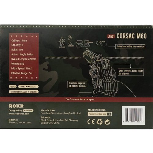 Traste sa zločinci! Stavebnica revolvera z preglejky. Ihneď zaujme detailným prevedením a možnosťou strieľať pribalenými gumičkami na figúrky, ktoré sú súčasťou stavebnice, a to až do vzdialenosti piatich metrov. Očarí všetkých malých ochrancov spravodlivosti. Skladačka je dodávaná v nezloženom stave, balená v krabici. Vybavené detailným návodom na zostavenie. Hlavné vlastnosti: skladačka zbrane, 5 figúrok a 6 nábojov102 precízne vyrezaných dielikovnízka obtiažnosť zostaveniadostrel až 5 m