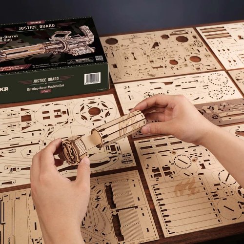 Pripraviť, zostaviť, zamerať, strieľať! Rozprúdite si krv. Máte dostatok adrenalínu pre túto otočnú, cvakajúcu a strieľajúcu obojručnú zbraň? Guľomet s otočnou hlavnou ROKR je 3D drevená puzzle zbraň, ktorej vrcholom je šesť otočných hlavných, z ktorých každá dokáže vystreliť šesť gumičiek. To je 36 vysokorýchlostných rán, ktoré môžete nabiť na odnímateľnú zostavu otočné hlavne. Táto kráska, inšpirovaná modelom XM556, naučí fanúšikov všeličo o mechanike rotačných guľometov bez toho, aby pritom mala masívnu hmotnosť. Tiež sa vyhýba zraneniu živých cieľov tým, že ako strely používa gumičky. Staňte sa svojim vlastným akčným hrdinom a objednajte si ten svoj ešte dnes! Táto stavebnica technického modelu je skvelým prvkom v akejkoľvek zbierke, či už ide o vystavenie alebo ako darček pre nadšencov do hračiek a filmov či vojenskej veteránov po celom svete. Šesťhlavňový kanón má jednoosý synchronizovaný systém riadenia paľby, ktorý ako muníciu používa gumové pásy. Každá zo šiestich hlavných pojme šesť gumových pásov pre celkom 36 výstrelov, poháňaných účinným prevodovým mechanizmom. Pre rovnomerné napnutie a plynulú streľbu vkladajte muníciu jednu po druhej a otáčajte hlavnú, kým všetky hlavne nebudú mať 6 gumičiek. Predná spúšť otáča hlavné a svetlom ohnivého draka, zatiaľ čo horná spúšť spúšťa gumičky pre dvojnásobnú zábavu a akciu. Hlavné vlastnosti: 412 presných dielikovľahká montáž bez použitia lepidlaťažká obtiažnosť zostavenierýchly, ale bezpečný systém streľby36 rýchlopalných strelodnímateľná hlaveňjedinečný dekoračný prvokvhodné ako zberateľský prvok
