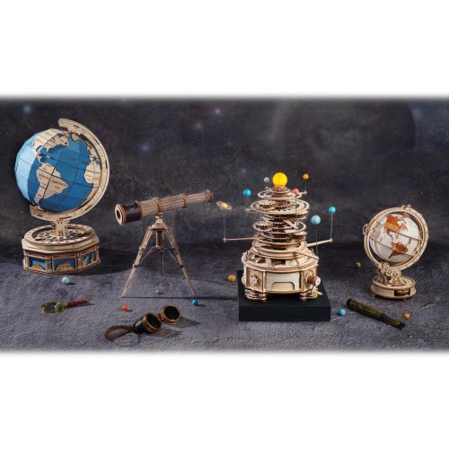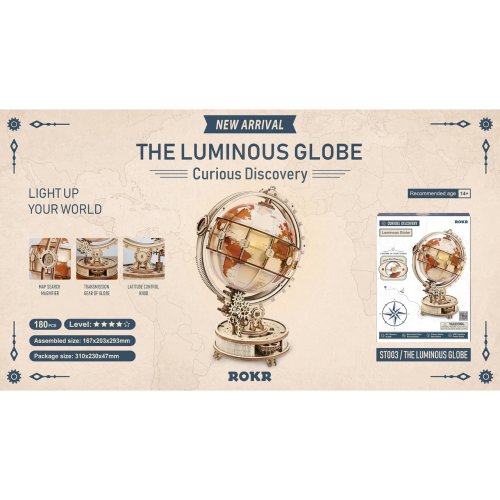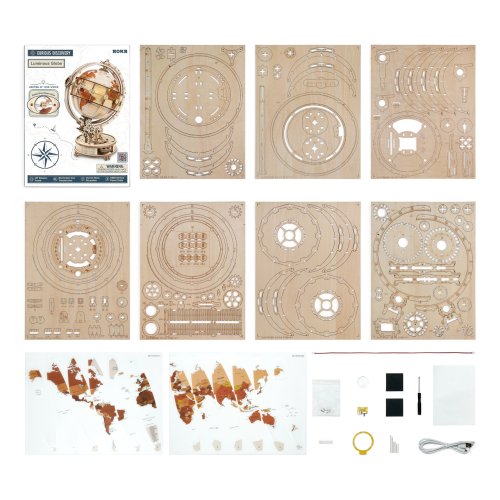Vďaka stavebnici glóbusu z preglejky sa nestratíte vo svete, a to ani v noci! Prostredníctvom jeho stavby môžete dať oddýchnuť svoje mysle od každodenného zhonu, preveriť svoje zručnosti, trpezlivosť a schopnosť sústredenia. Výsledný model môžete využiť ako atraktívnu nočnú lampičku, na tento účel je vo vnútri vybavený LED svetelným zdrojom s nízkou spotrebou, s nenápadným vypínačom a napájaním v podobe rozšíreného microUSB, či USB‑A konektora. Glóbom je možné otáčať prostredníctvom čiastočne odhalenej a pútavo spracovanej sústavy prevodov. Na svojom obvode je opatrený aj mechanicky ovládanou lupou, s pomocou ktorej prečítate aj najdrobnejšie nápisy na jeho povrchu. Členitá konštrukcia je vyvedená v retro štýle, zdobia ju početné ornamenty, ale aj stupnice na určovanie zemepisnej polohy, alebo označenie časových pásiem. Skladačka je dodávaná v nezloženom stave, balená v krabici. Vybavené detailným návodom na zostavenie. Hlavné vlastnosti:180 precízne vyrezaných dielikovvysoká obtiažnosť zostaveniepraktická lupa uľahčujúca čítaniesvetelný efekt s napájaním pomocou microUSB a USB‑A