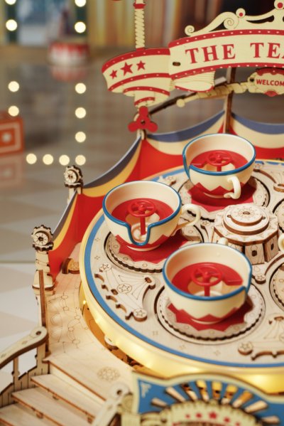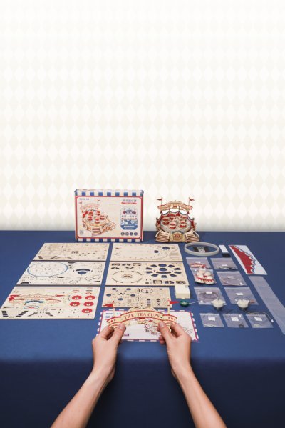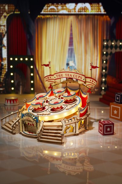 Sada mechanického dreveného 3D puzzle na zostavenie hracej skrinky v tvare púťového kolotoča.