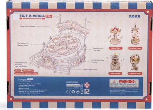 Obtiažnosť: 4 zo 5 (podľa rozdelenia Robotime). Orientačná doba na zloženie: 5,5 hodín. Na prevádzku je potrebné 3 ks batérie AAA 1,5V (nie sú súčasťou balenia). Balenie obsahuje: predrezané drevené dieliky, príslušenstvo na zostavenie modelu, obrázkový návod