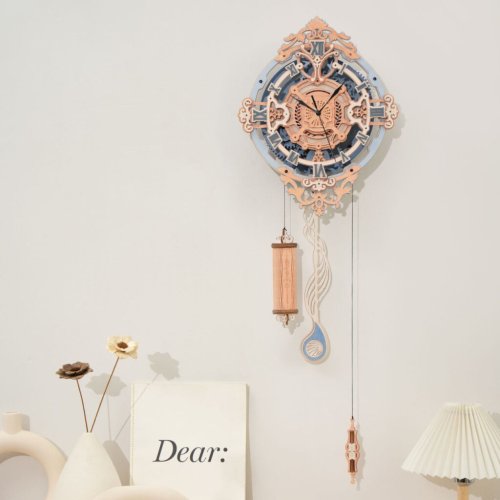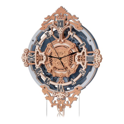 Skladačka nástenných hodín ponúka hneď dvojitú porciu zábavy a relaxácie. Uvoľnite sa pri zostavovaní rozmerného ciferníka podrobne zdobeného ornamentmi a funkčného krokového mechanizmu. Hotové hodiny Vás potom budú môcť tešiť upokojujúcim tikotom a kmitavým pohybom kyvadla. Starostlivo zvolená farebná schéma kombinujúca odtiene prírodného dreva s modrou a oranžovou farbou z nich urobí neprehliadnuteľnú ozdobu Vašej izby. Presné určovanie času pre praktickosť zaisťuje nezávislý, batériovo napájaný strojček. Nemusíte sa preto starať o naťahovanie a mechanizmus využívať len vo chvíľach oddychu, na navodenie atmosféry. Rýchlosť jeho tikania je možné individuálne prispôsobiť úpravou a doplnením závažia, napríklad v podobe mincí. Balenie obsahuje spojovací materiál na zavesenie hodín na stenu, a ich ciferník je potom možné dodatočne natáčať tak, aby bol vždy rovno. Dodávané v nezloženom stave, balené v krabici. Vybavené detailným návodom na zostavenie. Hlavné vlastnosti:nezávislý elektrický hodinový strojček (1×AA batéria nie je súčasťou balenia)funkčný kyvadlový mechanizmus231 precízne vyrezaných dielikovstredná obtiažnosť zostavenia
