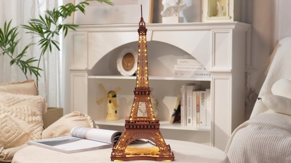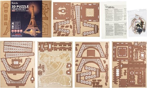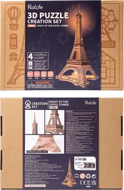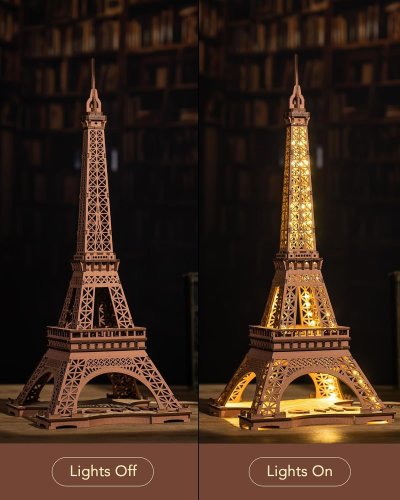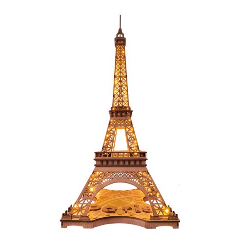 Zábavné drevené 3D puzzle od ROBOTIME z radu Rolife – Architektúra. Eiffelova veža z r.1889 , známa parížska dominanta, je technologickým majstrovským dielom v dejinách stavebníctva. Jej jedinečná konštrukcia sa stala revolúciou v stavebnom inžinierstve a architektonickom dizajne. Vďaka jasným svetlám a hrdzavým doskám je tento model živý a realistický.