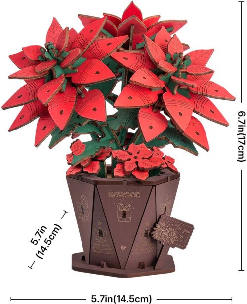 Prineste si do svojho domova sviatočnú atmosféru s touto nádhernou vianočnou hviezdou z 3D drevenej stavebnice. Vianočná hviezda je symbol Vianoc, nádeje a nových začiatkov a ožíva v podobe elegantnej DIY dekorácie zo série Wooden Bloom Craft Series, ktorá obsahuje 153 precízne spracovaných dielikov. Po zostavení vznikne realistický model vianočnej kvetiny s prispôsobiteľnými, flexibilnými stonkami. Kvetináč s jemne zdobenými kvetinovými motívmi dodáva aranžmán elegantný vzhľad a jeho základňu možno jednoducho odňať, ak chcete dekoráciu upraviť do nižšej podoby. Výsledkom je pôsobivá vianočná ozdoba, ktorá krásne vynikne na stole, okennom parapete alebo poličke. Chystáte sa ju darovať? Súčasťou balenia je aj blahoželanie, vďaka ktorému môžete pripojiť osobný a srdečný vianočný odkaz. Vytvoríte tak originálny darček, ktorý poteší každého milovníka kreatívneho tvorenia. Táto 3D skladačka je skvelým spôsobom, ako si užiť kreatívne a edukatívne hranie a zároveň vytvoriť nádherný model, ktorý sa môže stať netradičným darčekom či ozdobou interiéru. Skladanie skladačky podporuje rozvoj jemnej motoriky, priestorového myslenia a trpezlivosti. Pozvite svoju rodinu alebo priateľov a užite si zábavné tvorenie bez nutnosti použitia lepidla alebo nástrojov. Všetky dieliky sú presne vyrezané, a ľahko do seba zapadnú, aby výsledok bol stabilný a odolný. Skladačka je dodávaná v nezloženom stave, zabalená v krabici s podrobným návodom na zostavenie.