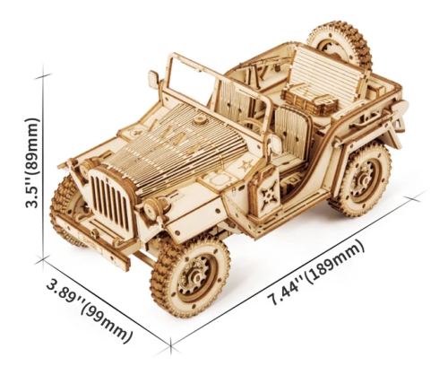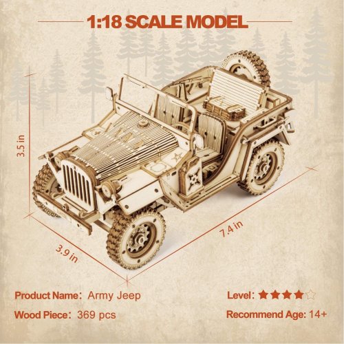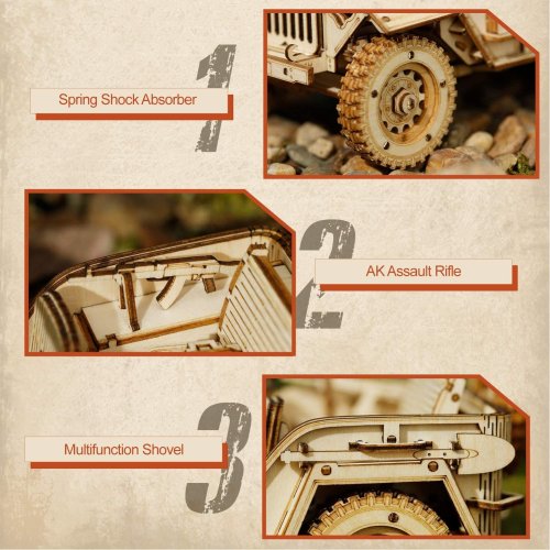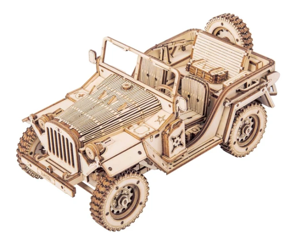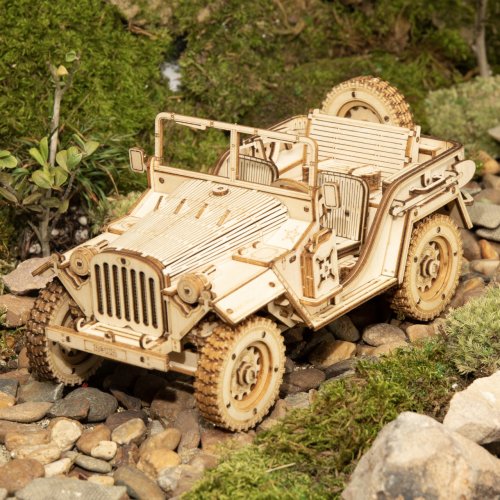 Detailný model vojenského džípu v mierke 1:18 bol inšpirovaný legendárnymi džípmi GAZ zo 40. rokov, u nás známymi pod prezývkou „Čapajev“. Je určený na vystavenie a dekoráciu, nie je preto pohyblivý. Pre radosť všetkým technickým nadšencom je však vybavený funkčným odpružením náprav. Prírodná úprava je univerzálne vhodná do každého interiéru, model však môžete prispôsobiť a nafarbiť podľa vlastných predstáv. Nezabudnite sa nám svojou úpravou pochváliť! Skladačka je dodávaná v krabici spolu s podrobným ilustrovaným návodom na zostavenie. Hlavné vlastnosti:369 precízne vyrezaných dielikovstredná obtiažnosť zostaveniaodpruženej nápravy