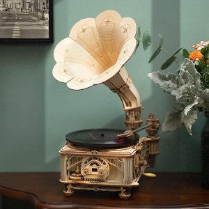 Ako znie história? Stavebnica gramofónu z preglejky. Retro designom, inšpirovaným gramofónom vynájdeným Thomasom Edisonom, Vás prenesie do 19. storočia. Nie je to len model, skutočne vie prehrávať dosky a je k nemu aj dodávaná 7" gramoplatňa obsahujúca trojicu piesní (The Merry Gent, Memory Of A Dance, The Giant Killers). Zariadenie disponuje ručne, kľukou, poháňanou mechanikou a dynamom. Je možné ho ale poháňať aj elektricky, pomocou vstavaného micro-USB konektora. Podporuje dosky s rozmermi 17,5 cm (7") a 25 cm (10") a všetky im zodpovedajúce rýchlosti prehrávania. Hlasitosť reprodukcie možno upravovať pomocou otočného ovládača. Jedinečný darček pre všetkých milovníkov domácich majstrov a hudby, ale aj luxusná interiérová dekorácia do izby či kancelárie. Skladačka je dodávaná v nezloženom stave, balená v krabici. Vybavené detailným návodom na zostavenie. USBdodávaná gramoplatňa obsahuje piesne:The Merry GentMemory Of A DanceThe Giant Killers