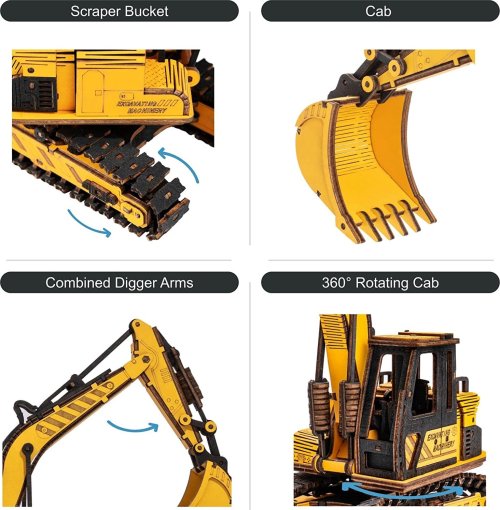 Laserom vyrezávané dieliky z 2 mm lipovej preglejky. Jednotlivé dieliky sa vytláčajú priamo z preglejky, postupujte postupne a opatrne. Realistické detaily: pohyblivé rameno a lyžica, pohyblivé pásy, otočná kabína o 360 °, jazda vpred a vzad, 1x zátaras, 1x dopravný kužeľ. Bez nutnosti lepenia. Kvalitné, bezpečné a netoxické materiály. Rozvíja technické myslenie, predstavivosť, cit pre detail a jemnú motoriku. Prekrásny darček pre väčšie deti aj dospelých. Po dokončení pôsobivá dekorácia. Načítaním QR kódu z obalu zobrazíte video.