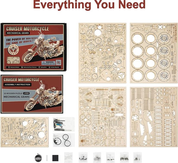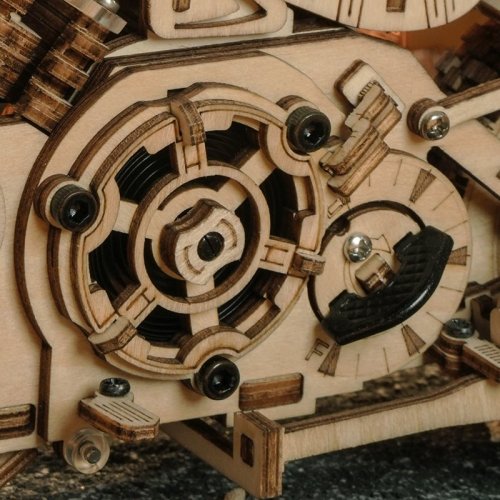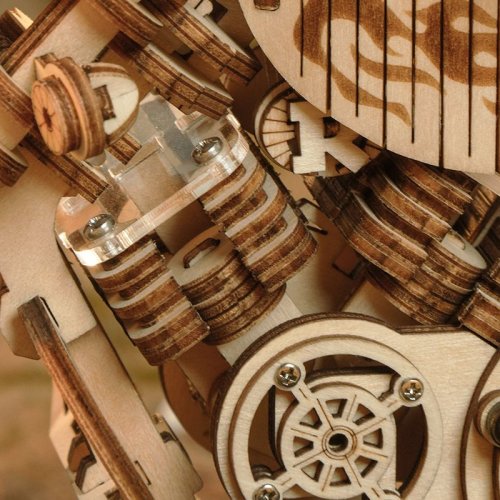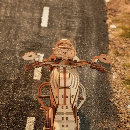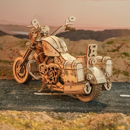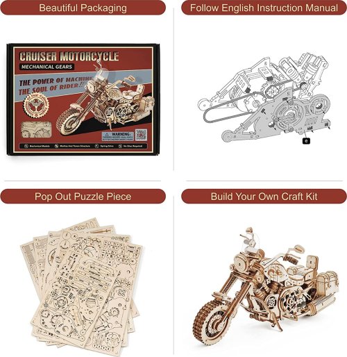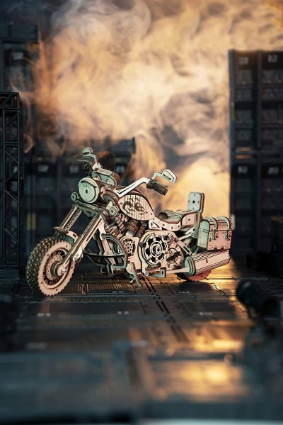Bočné otvárateľné úložné boxy ako skutočný motocykel. Prepínač pružinového pohonu. Motocykel môže ísť rovno asi 2-3 metre. Simulácia štvorvalcového motora - pri jazde motocykla je možné vidieť pohyb piestov motora. Nezávislé predné odpruženie, otočné riadidlá, zoštíhlená karoséria, čelné sklo. Laserom vyrezávané dieliky z 2 mm lipovej preglejky. Jednotlivé dieliky sa vytláčajú priamo z preglejky, postupujte postupne a opatrne. Kvalitné, bezpečné a netoxické materiály. Rozvíja technické myslenie, predstavivosť, cit pre detail a jemnú motoriku. Prekrásny darček pre väčšie deti aj dospelých. Po dokončení pôsobivá dekorácia.
